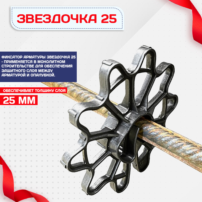 Фиксатор арматуры Звездочка 25 – применяется в монолитном строительстве для обеспечения защитного слоя между арматурой и опалубкой. Используется при заливке вертикальных конструкций: стен, колонн, опор, стел, пилонов. Обеспечивает толщину слоя 25 мм. Фиксатор также используется для закрепления каркасов, стержней, сварной сетки.