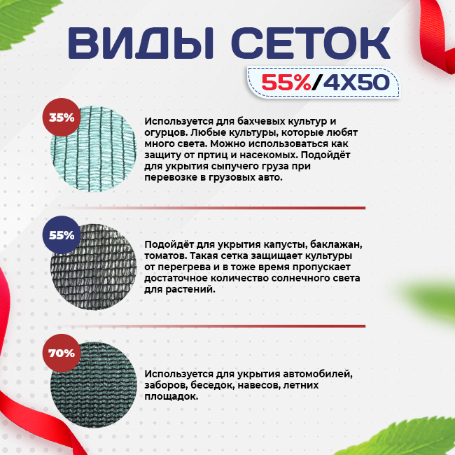 Сетка затеняющая, как и сетка фасадная, используется в качестве укрывного, защитного и теневого материала. Модель Сетка затеняющая фасадная 50% размером 4х50 метров имеет среднюю затеняющую функцию, которая оптимально подходит для укрытия растений и теплиц. Эта сетка для клубники, помидор и огурцов - самый лучший вариант по степени притенения. Благодаря нее растения получают достаточное количество света и тепла, но при этом не горят на солнце. Также сетка отлично подходит для создания теневых заборов, зон отдыха, навесов и скрытия территория от посторонних глаз (для большей непрозрачности материал можно сложить вдвое). Еще ее можно использовать при строительстве и ремонте, укрывая фасады зданий и строительные леса.